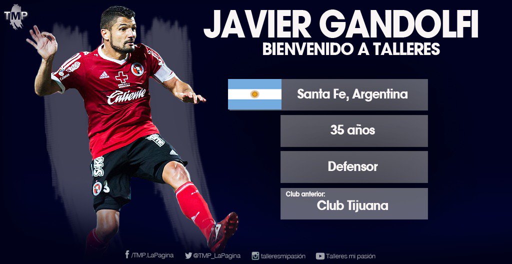 Oficialmente este Sábado Talleres sumó su primer refuerzo y se trata de Javier Gandolfi, defensor central de 35 años quien llega a la T desde Tijuana de México, donde fue capitán muchos años y tiene el cariño de la gente.